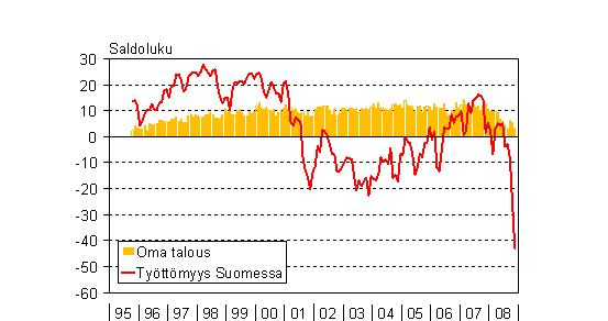 A1 Kuluttajien odotukset työttömyydestä Suomessa ja omasta taloudestaan vuoden kuluttua 10/1995 - 11/2008