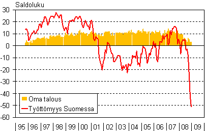 A1 Kuluttajien odotukset työttömyydestä Suomessa ja omasta taloudestaan vuoden kuluttua 10/1995 - 12/2008