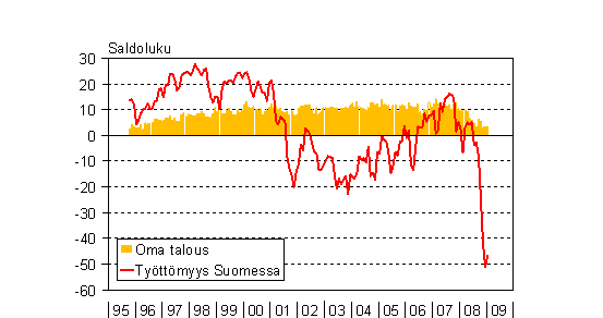 A1 Kuluttajien odotukset työttömyydestä Suomessa ja omasta taloudestaan vuoden kuluttua 10/1995 - 1/2009