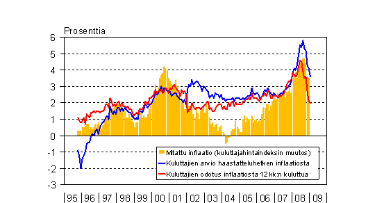 A7 Kuluttajien inflaationäkemykset ja mitattu inflaatio 10/1995 - 1/2009