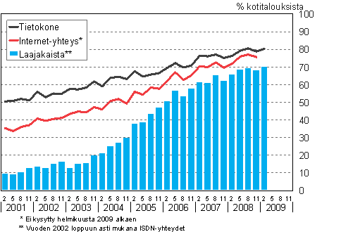C 2 Tietokoneiden ja internet-yhteyksien yleisyys kotitalouksissa 2/2001-2/2009