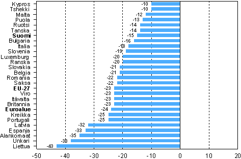 Kuluttajien luottamusindikaattorin poikkeama maan keskiarvosta EU-maissa, maaliskuu 2009*