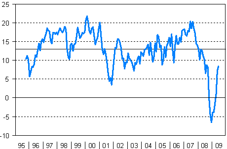 | Konsumenternas förtroendeindikator | 13,0 | 21,8 | -6,5 | 10,2 | 7,2 | 8,4 | - |