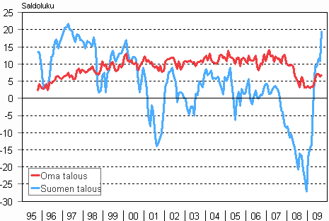 Syyskuussa jo yli puolet eli 55 prosenttia kuluttajista uskoi, että Suomen taloustilanne paranee seuraavan vuoden aikana. Kuluttajista 16 prosenttia puolestaan arvioi maamme talouden huononevan. Vastaavat osuudet olivat elokuussa 45 ja 21 prosenttia ja vuosi sitten pessimistiset 14 ja 44 prosenttia. Oman taloutensa kohentumiseen luotti syyskuussa 25 prosenttia kuluttajista ja 13 prosenttia pelkäsi taloutensa huononevan vuoden kuluessa.