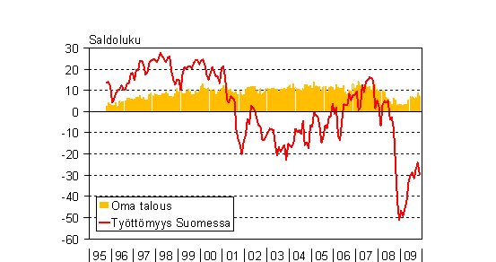 A1 Kuluttajien odotukset työttömyydestä Suomessa ja omasta taloudestaan vuoden kuluttua 10/1995-11/2009