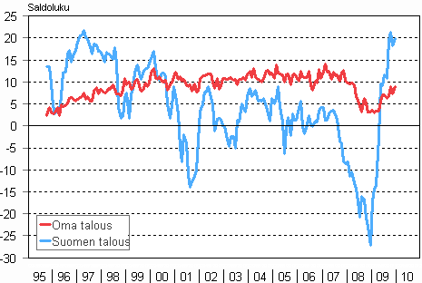 Joulukuussa 54 prosenttia kuluttajista uskoi, että Suomen taloustilanne paranee seuraavan vuoden aikana. Kuluttajista 15 prosenttia puolestaan arvioi maamme talouden huononevan. Vastaavat osuudet olivat vuosi sitten hyvin pessimistiset 16 ja 57 prosenttia. Oman taloutensa kohentumiseen luotti joulukuussa 26 prosenttia kuluttajista ja vain 11 prosenttia pelkäsi taloutensa huononevan vuoden kuluessa. Vuosi sitten nämä osuudet olivat 21 ja 16 prosenttia kuluttajista.