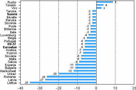 Kuluttajien luottamusindikaattorin poikkeama maan keskiarvosta EU-maissa, marraskuu 2009*