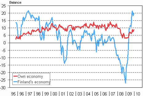 Consumers' expectations concerning their own and Finland's economy in 12 months' time 10/1995-12/2009