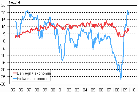 Konsumenternas förväntningar på den egna ekonomin och Finlands ekonomi om ett år 10/1995-12/2009