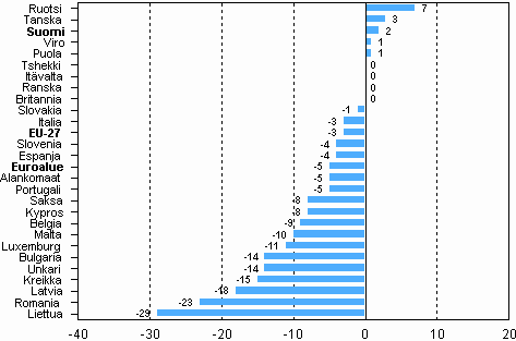 Kuluttajien luottamusindikaattorin poikkeama maan keskiarvosta EU-maissa, tammikuu 20101)