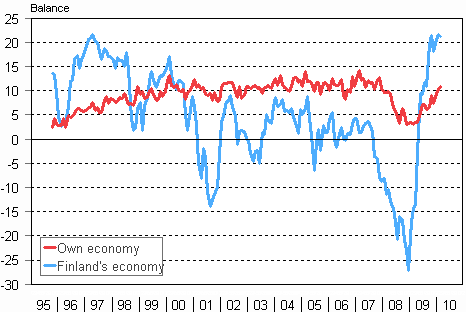 Consumers' expectations concerning their own and Finland's economy in 12 months' time 10/1995-2/2010