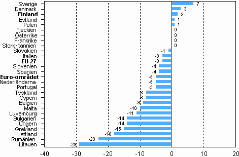 Konsumenternas förtroendeindikators avvikelse från landets medeltal i EU-länderna, januari 20101)