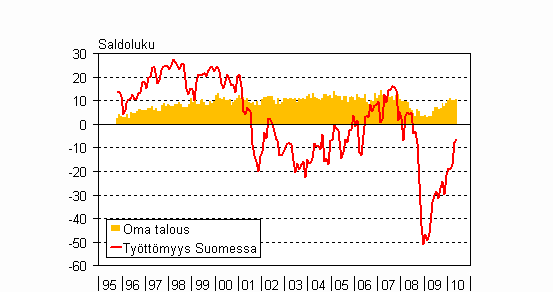 A1 Kuluttajien odotukset työttömyydestä Suomessa ja omasta taloudestaan vuoden kuluttua 10/1995-5/2010
