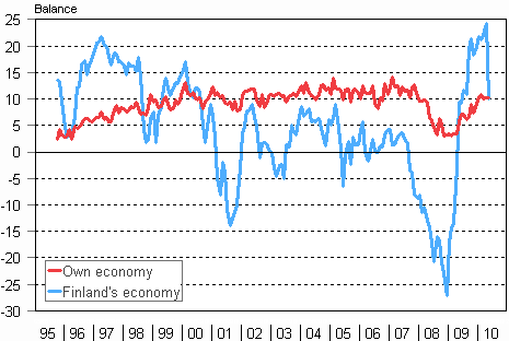 Consumers' expectations concerning their own and Finland's economy in 12 months' time 10/1995-5/2010