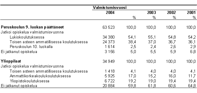 Vuoden 2004 peruskoulun 9. luokan päättäneistä jatkoi opiskelua samana vuonna 95 prosenttia, ylioppilaista 40 prosenttia