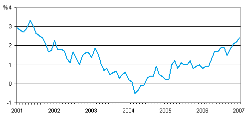 Förändringen av konsumentpriserna på årsnivå 1/2001-1/2007