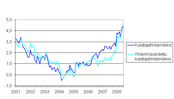 Kuluttajahintaindeksin ja yhdenmukaistetun kuluttajahintaindeksin vuosimuutokset 2001-6/2008