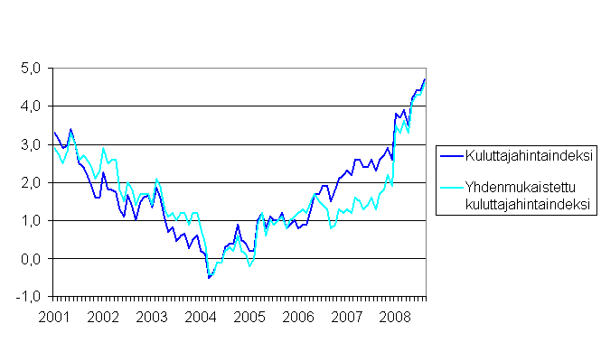 Kuluttajahintaindeksin ja yhdenmukaistetun kuluttajahintaindeksin vuosimuutokset 2001-8/2008