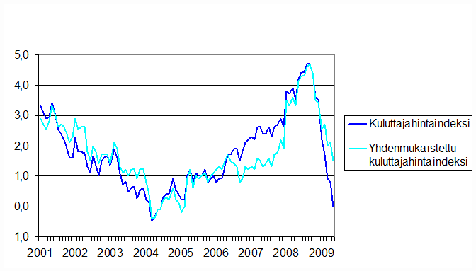 Kuluttajahintaindeksin ja yhdenmukaistetun kuluttajahintaindeksin vuosimuutokset 2001-5/2009