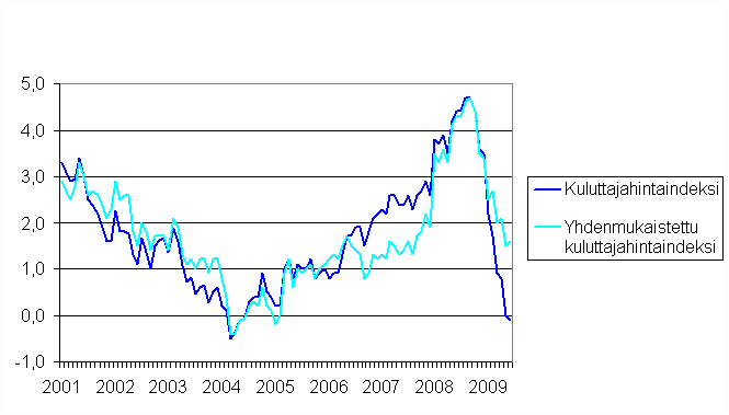 Kuluttajahintaindeksin ja yhdenmukaistetun kuluttajahintaindeksin vuosimuutokset 2001-6/2009