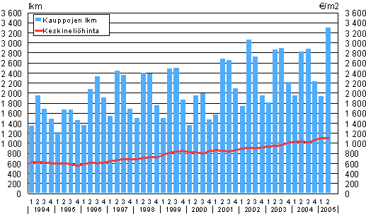 Omakotitalokauppojen lukumäärät ja keskineliöhinnat 1994/1-2005/2