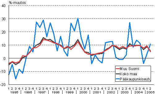 Omakotitalojen nimellishintaindeksin vuosimuutos 1995/1-2005/2