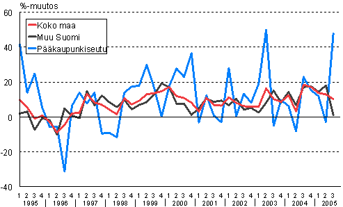 Omakotitalotonttien nimellishintaindeksin vuosimuutos 1995/1-2005/3
