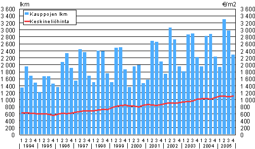 Omakotitalokauppojen lukumäärät ja keskineliöhinnat 1994/1-2005/4