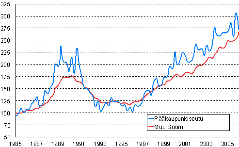 Omakotitalojen hintakehitys 1985/1 - 2006/1, indeksi 1985=100