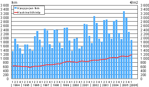 Omakotitalokauppojen lukumäärät ja keskineliöhinnat 1994/1-2006/1