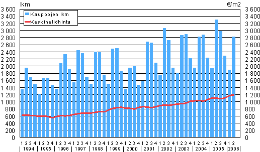 Omakotitalokauppojen lukumäärät ja keskineliöhinnat 1994/1-2006/2