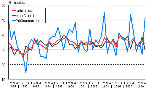 Omakotitalotonttien nimellishintaindeksin vuosimuutos 1. neljännes 1995 - 4. neljännes 2006