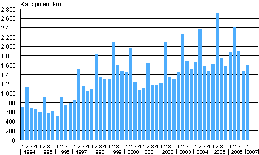 Omakotitalotonttien kauppojen lukumäärät 1. neljännes 1994 - 1. neljännes 2007