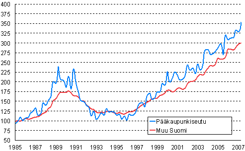Omakotitalojen hintakehitys 1. neljännes 1985 - 2. neljännes 2007, indeksi 1985=100