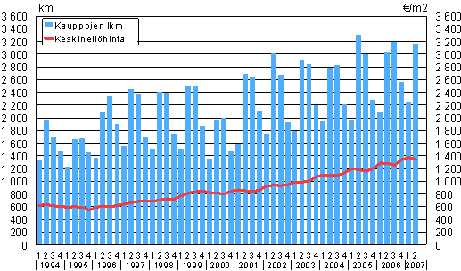 Omakotitalokauppojen lukumäärät ja keskineliöhinnat 1. neljännes 1994 - 2. neljännes 2007