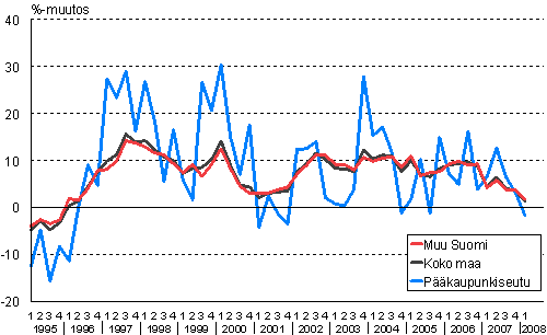 Omakotitalojen nimellishintaindeksin vuosimuutos 1. neljännes 1995 - 1. neljännes 2008