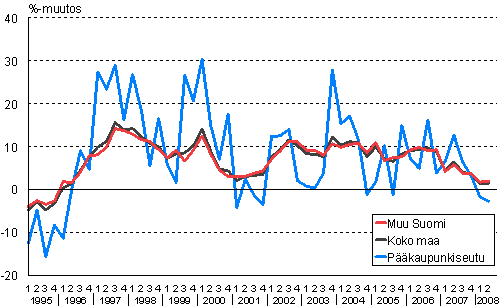 Omakotitalojen nimellishintaindeksin vuosimuutos 1. neljännes 1995 - 2. neljännes 2008