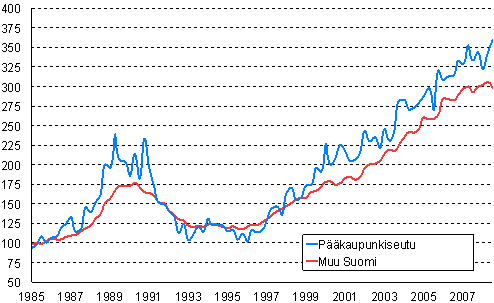 Omakotitalojen hintakehitys 1. neljännes 1985 - 3. neljännes 2008, indeksi 1985=100