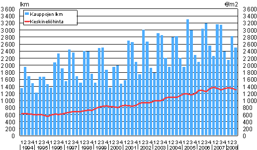 Omakotitalokauppojen lukumäärät ja keskineliöhinnat 1. neljännes 1994 - 3. neljännes 2008