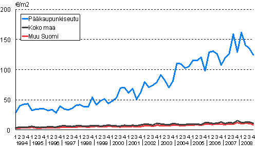 Omakotitalotonttien keskineliöhinnat 1. neljännes 1994 - 4. neljännes 2008