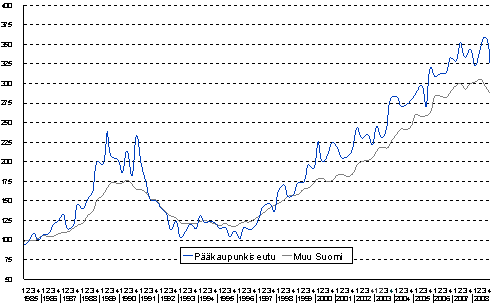 - Omakotitalojen hintakehitys 1. neljännes 1985 - 4. neljännes 2008, indeksi 1985=100 (13.3.2009)