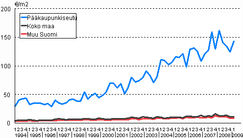 Omakotitalotonttien keskineliöhinnat 1. neljännes 1994 - 1. neljännes 2009