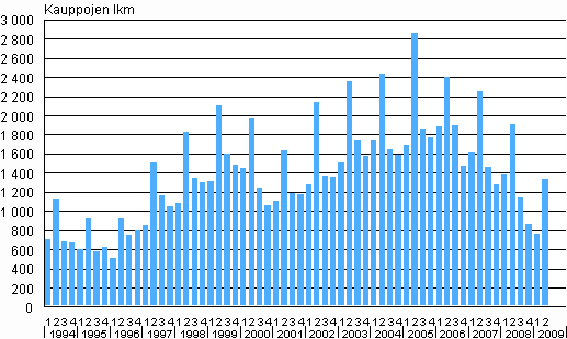 Omakotitalotonttien kauppojen lukumäärät 1. neljännes 1994 - 2. neljännes 2009