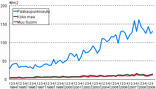 Omakotitalotonttien keskineliöhinnat 1. neljännes 1994 - 3. neljännes 2009