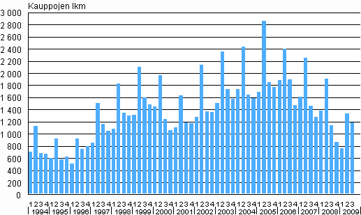 Omakotitalotonttien kauppojen lukumäärät 1. neljännes 1994 - 3. neljännes 2009
