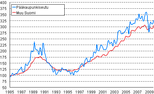 Omakotitalojen hintakehitys 1. neljännes 1985 - 4. neljännes 2009, indeksi 1985=100