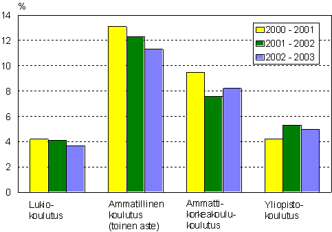 Tutkintoon johtavan koulutuksen opiskelijoista vajaa 6 prosenttia keskeytti opinnot eikä jatkanut missään tutkintoon johtavassa koulutuksessa lukuvuoden 2002 - 2003 aikana. Eniten keskeyttäneitä oli toisen asteen ammatillisessa koulutuksessa ja vähiten lukiokoulutuksessa.