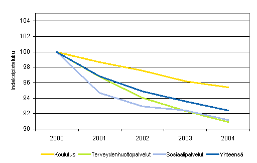 Kuntien ja kuntayhtymien koulutuksen, terveydenhuoltopalveluiden ja sosiaalipalveluiden kokonaistuottavuuden kehitys vuosina 2000-2004 (2000=100)