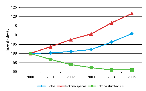 Kuntien ja kuntayhtymien terveydenhuoltopalveluiden tuotoksen volyymin, kokonaispanoksen volyymin ja kokonaistuottavuuden kehitys vuosina 2000-2005 (2000=100)
