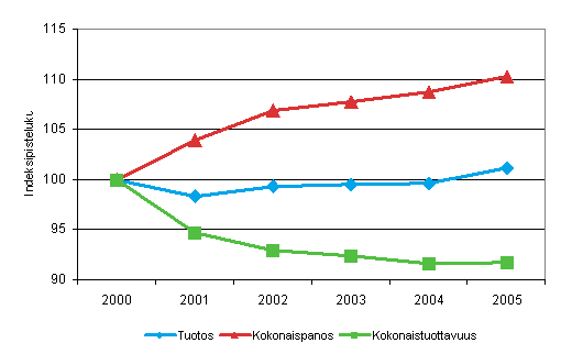 Kuntien ja kuntayhtymien sosiaalipalveluiden tuotoksen volyymin, kokonaispanoksen volyymin ja kokonaistuottavuuden kehitys vuosina 2000-2005 (2000=100)